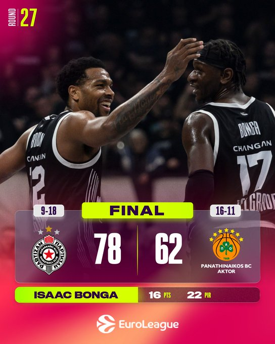 El Panathinaikos disfrutó entonces de su mejor racha del partido, con un parcial de 0-9, pero el Partizan recuperó rápidamente la compostura y puso el partido en las manos de los visitantes. Cam Payne dirigió el ataque del Partizan y lideró al equipo local con 18 puntos, 4 rebotes y 5 asistencias, mientras que Sterling Brown e Isaac Bonga aportaron 16 cada uno.