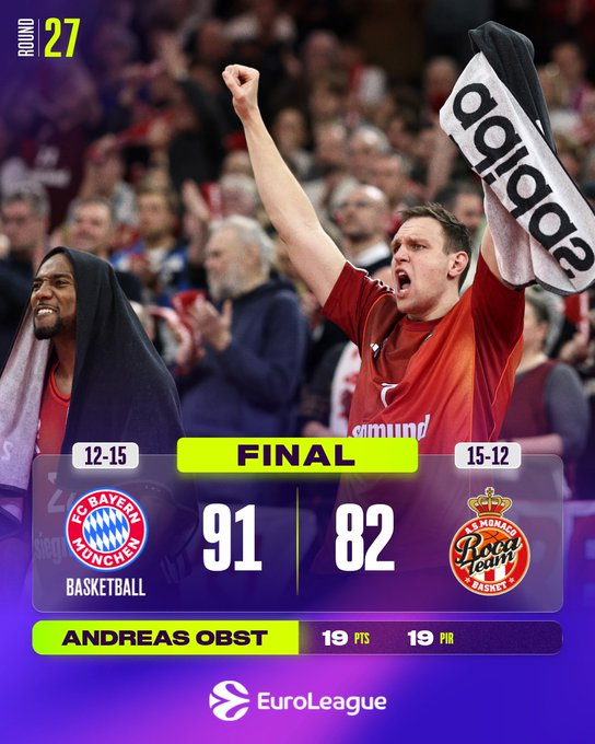 Andi Obst lideró al Bayern con 19 puntos, anotando 5 triples, mientras que Isiaha Mike añadió 12. Oscar da Silva y Neno Dimitrijevic aportaron 11 puntos cada uno, y Wenyen Gabriel terminó con 10 puntos y 8 rebotes. Mike James registró su segunda mejor actuación anotadora de la temporada con 30 puntos para el Mónaco, con Nemanja Nedovic y Jaron Blossomgame aportando 12 puntos cada uno.