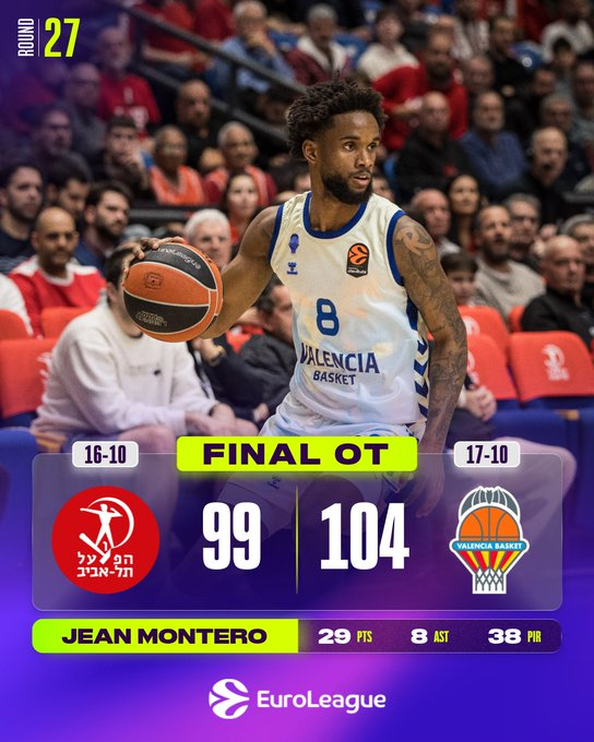 Los visitantes se recuperaron anotando 52 puntos en la segunda mitad y llevando el partido a la prórroga, donde Jean Montero tomó las riendas al anotar 10 de los 16 puntos del Valencia para sentenciar el partido. El equipo español consiguió su primera victoria a domicilio en cuatro partidos, mejorando su récord a 17-10. Mientras tanto, el Hapoel sufrió su cuarta derrota consecutiva y cayó a 16-10.