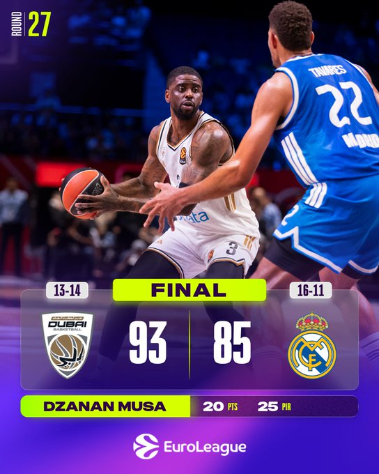 El Real Madrid cayó a 16-11 y acumula una racha de tres derrotas consecutivas. Dzanan Musa lideró a los ganadores con 20 puntos, su máximo de la temporada, contra su exequipo. McKinley Wright y Filip Petrusev anotaron 16 cada uno, Dwayne Bacon 15, Bruno Caboclo 11 y Aleksa Avramovic contribuyó con 10 para el Dubái. Facu Campazzo lideró al Real Madrid con 24 puntos. Walter Tavares añadió 17 puntos y 9 rebotes, mientras que Mario Hezonja consiguió 11 para los visitantes, que lideraban 66-68 al final del tercer cuarto. Musa anotó 12 puntos en los últimos 11 minutos, con la ayuda de Wright y Bacon para ayudar a Dubai a sentenciar el partido, 90-83, en el último minuto.