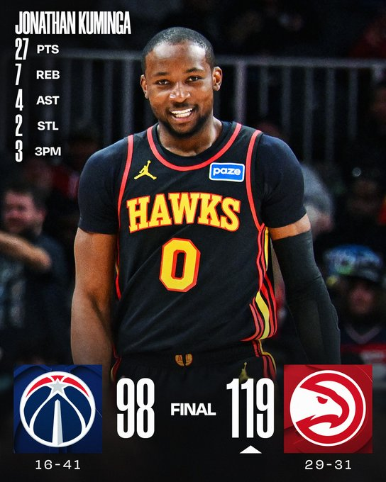 En el regreso simbólico de Trae Young a Atlanta, el show fue de Jonathan Kuminga, quien debutó con Atlanta Hawks con 27 puntos desde el banco. Los Hawks marcaron diferencias desde el inicio y arrasaron a unos Washington Wizards diezmados, con un tercer cuarto demoledor que sentenció el trámite.