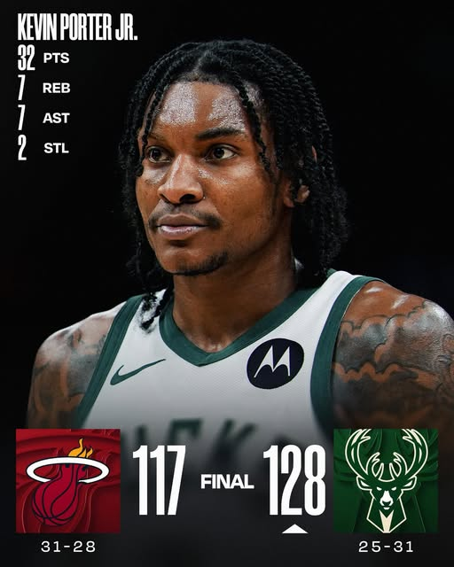 Sin Giannis Antetokounmpo, Milwaukee Bucks se apoyaron en los 32 puntos de Kevin Porter Jr. y en los 21 de Bobby Portis y Ryan Rollins para vencer a Miami Heat. En un cierre cambiante, un triple con falta de Porter y dos canastas seguidas de Rollins en el último minuto aseguraron la victoria tras remontar en el cuarto final.