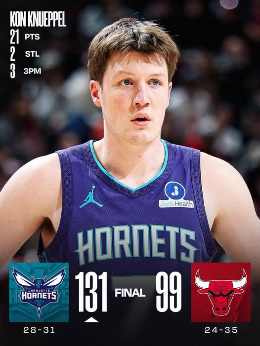 A puro triple, Charlotte Hornets logró su octava victoria consecutiva como visitante al aplastar a Chicago Bulls. Brandon Miller (23) y Kon Knueppel (21) encabezaron una noche histórica desde el perímetro, con 25 triples convertidos.