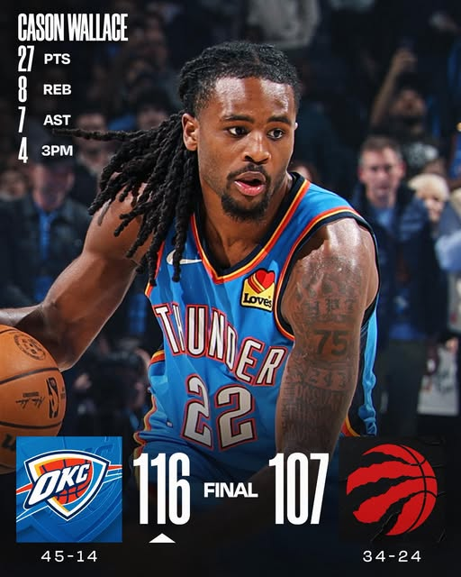 Sin Shai Gilgeous-Alexander, el líder del Oeste, Oklahoma City Thunder, volvió a imponerse con 27 puntos de Cason Wallace. Los Thunder sacaron una amplia ventaja en el tercer cuarto y resistieron la reacción de Toronto en el último período para sumar su quinta victoria en seis juegos.