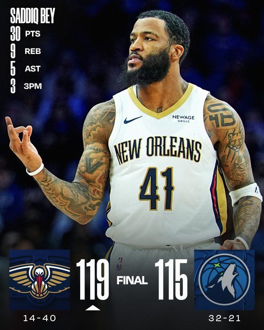 New Orleans Pelicans fue uno de los dos visitantes que se llevaron la victoria. Saddiq Bey fue el MVP del juego, rozando el doble-doble con 30 tantos y 9 rebotes. Por el lado de Minnesota sobresalió Anthony Edwards, con 35 unidades.