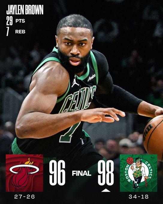 Boston se llevó una trabajada victoria ante Miami Heat. El elenco de Mazzulla se impuso como local luego de remontar 20 puntos. El mejor del encuentro fue Jaylen Brown, quien se despachó con 29 puntos y 7 rebotes.