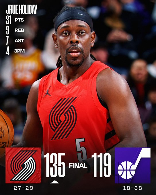 Jrue Holiday firmó su tope de la temporada con 31 puntos, además de 9 rebotes y 7 asistencias, mientras Donovan Clingan dominó con 23 unidades, 18 rebotes, 7 asistencias y 3 tapas. Jerami Grant sumó 18 y Scoot Henderson 15 en su cuarto juego del curso. En Utah, Brice Sensabaugh metió 28 y Bailey, Filipowski y Collier aportaron 15 cada uno. Blake Hinson debutó con 11 y acercó al Jazz a tres, pero un 11-2 final sentenció todo.