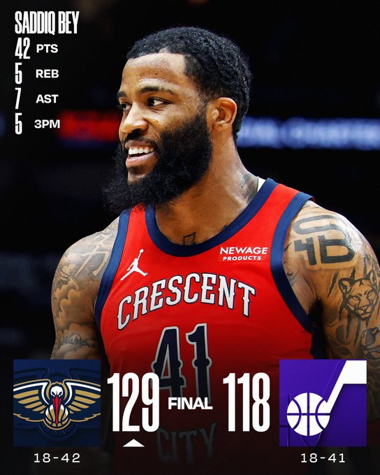 Saddiq Bey explotó con 42 puntos (14/20 de campo, 5/9 en triples y 9/9 libres) y Zion Williamson añadió 20 para el tercer triunfo consecutivo de los Pelicans. Dejounte Murray aportó 17 puntos y 9 asistencias en su regreso sostenido tras lesión; Utah tuvo a Ace Bailey (23) y Brice Sensabaugh (20), pero extrañó a Lauri Markkanen.