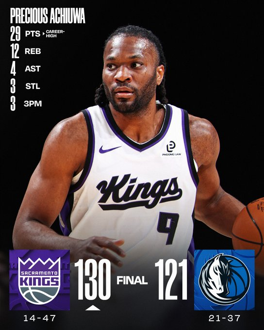 Precious Achiuwa logró un récord personal de 29 puntos más 12 rebotes y Maxime Raynaud añadió 22 para unos Kings que ganaron dos de los últimos tres tras una racha histórica de 16 derrotas. Naji Marshall firmó 36 puntos, 10 rebotes y 6 asistencias para Dallas, que perdió 11 de 13 y seis seguidos en casa.
