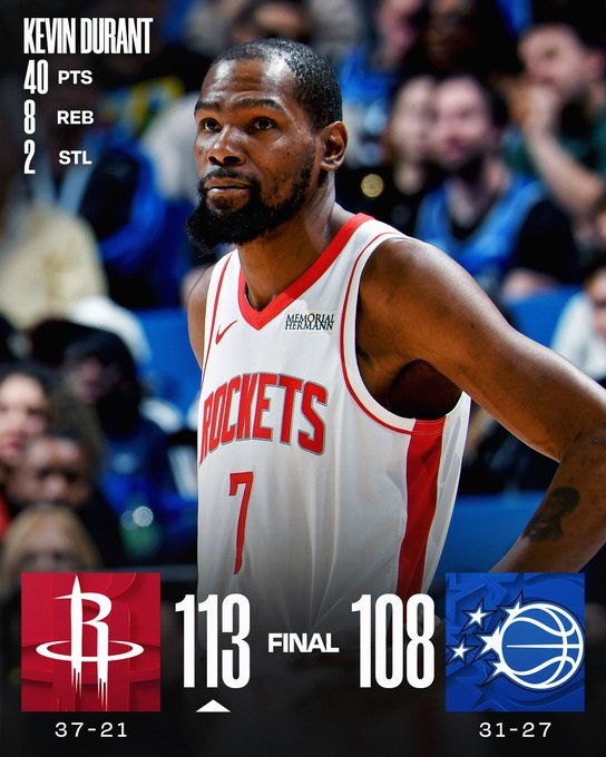 Kevin Durant explotó con 40 puntos (26 en el segundo tiempo) y lideró la remontada tras estar 19 abajo; Houston firmó un parcial de 21-0 en menos de cuatro minutos con Reed Sheppard (20 y cinco triples) como factor clave. Alperen Sengun sumó 16 puntos, 6 rebotes y 5 asistencias, mientras Desmond Bane anotó 30 y Paolo Banchero 19 puntos, 9 asistencias y 8 rebotes para Orlando.