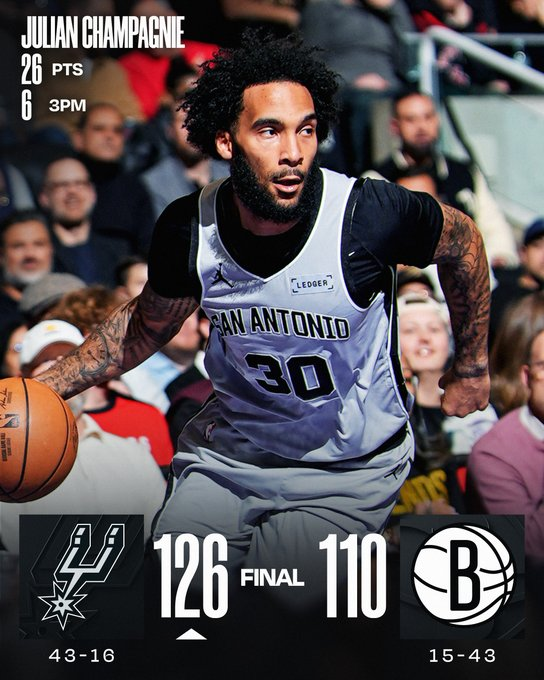 Julian Champagnie lideró con 26 puntos la 11ª victoria consecutiva de San Antonio (43-16), que tuvo aporte balanceado: Stephon Castle 18, Fox y Vassell 14 cada uno, Keldon Johnson 13 y Wembanyama 12. Michael Porter Jr. firmó 24 puntos y 14 rebotes para unos Nets que cayeron por sexta vez al hilo.