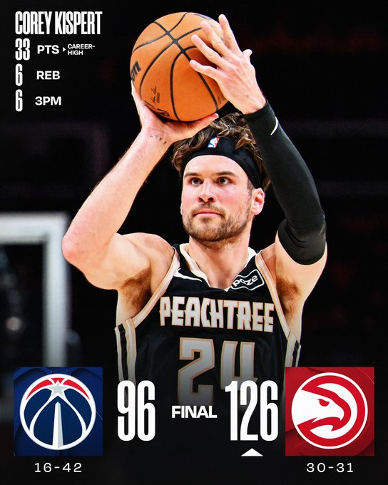 CJ McCollum (25 puntos) y Corey Kispert (33, con 6/11 en triples y 22 en el primer tiempo) castigaron a su exequipo y combinaron 58 unidades en la paliza de Atlanta. Dyson Daniels añadió 13 puntos, 11 asistencias y 5 robos, mientras que los Wizards, sin Anthony Davis ni Trae Young, tuvieron a Will Riley y Tre Johnson con 14 cada uno.