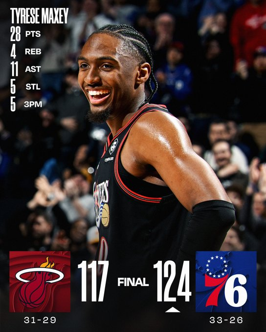 Tyrese Maxey metió 28 puntos, 11 asistencias y 5/12 desde el perímetro, incluidos 20 puntos en el primer cuarto; Joel Embiid sumó 26 puntos y 11 rebotes y Kelly Oubre 21 para la tercera victoria consecutiva. Bam Adebayo (29 y 14 rebotes) y Tyler Herro (25) lideraron a Miami. Philadelphia resistió tras dilapidar una ventaja de 16 y lo cerró con un triple de Embiid en el minuto final.