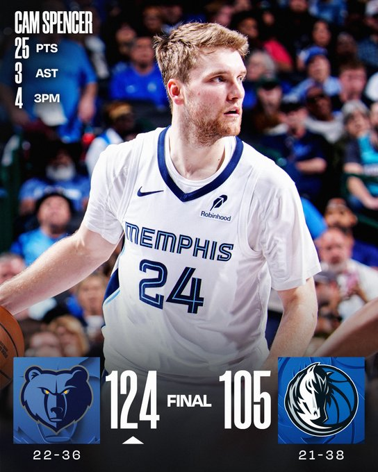 Memphis cortó una racha adversa con muchos lesionados. Cam Spencer lideró desde el banco con 25 puntos y Olivier-Maxence Prosper firmó 16 puntos y 10 rebotes; Scotty Pippen Jr. agregó 15. Dallas, que perdió su séptimo consecutivo en casa, tuvo 16 puntos de Brandon Williams y 14 de Daniel Gafford, mientras el novato Cooper Flagg volvió a faltar. Un parcial 20-8 antes del descanso encaminó la ventaja, que llegó a ser de 34 en el tercer cuarto.