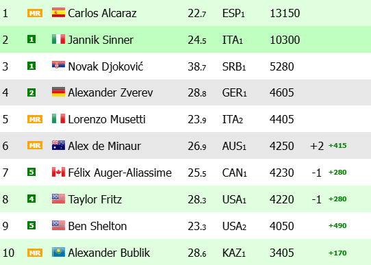 Ben Shelton consiguió su cuarto título ATP en Dallas, pero ello no ha ayudado a subir de la novena posición (4.050 puntos) y Alexander Bublik, semifinalista en Rotterdam, también se queda en la décima posición con 3.405 puntos. Lo que le ha ocurrido a Shelton, también le ha pasado a Fran Cerúndolo, que se ha alzado con el título de Buenos Aires, pero sigue en la 19ª posición con 2.220 puntos.