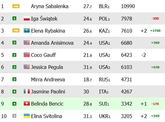 A pesar de su derrota, Aryna Sabalenka se mantiene como la reina del circuito. Al repetir como finalista en el Open de Australia ni gana ni pierde puntos y se mantiene como al inicio del torneo, es decir, con 10.990 puntos. Además, aumenta su brecha con Iga Swiatek, que perdió 350 puntos al no repetir semifinales, y les separan un total de 3.012 puntos. Sin embargo, la polaca, con 7978 puntos, debería de mirar más hacia el tercer puesto, donde Elena Rybakina, que suma 1760 tras ganar el Open de Australia, solo está a 368 puntos del segundo escalón (7610).