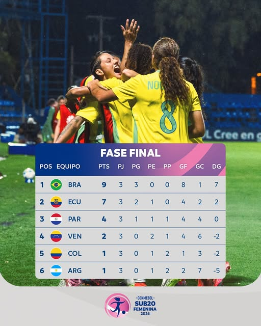 Brasil logró la clasificación a la Copa Mundial Femenina Sub20 y se mantuvo líder en la tabla tras imponerse ante Argentina por 4-0. Evelin Bonifácio anotó el primero a los 3’, Clarinha sumó un tanto más a los 35’, Brendha definió el tercero a los 64’ y finalmente Carioca logró el cuarto a los 90+2′ para la gran victoria. En la siguiente fecha, Brasil se enfrentará a Ecuador y Argentina a Paraguay.