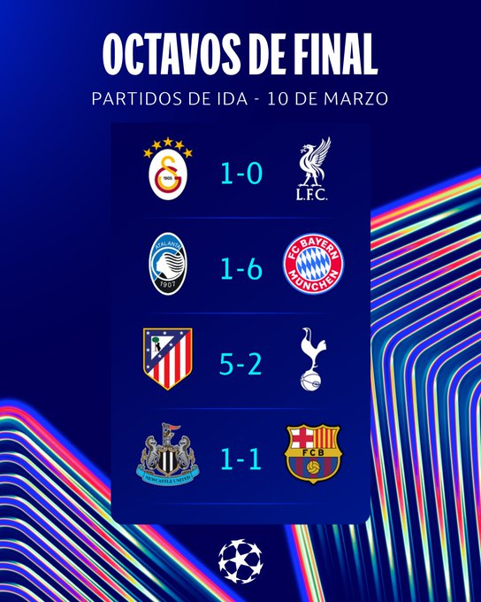 Atletico de Madrid y Bayern München se acercan a los cuartos tras dos goleadas en los duelos de este martes, donde empataron Newcastle – Barcelona y ganó Galatasaray.