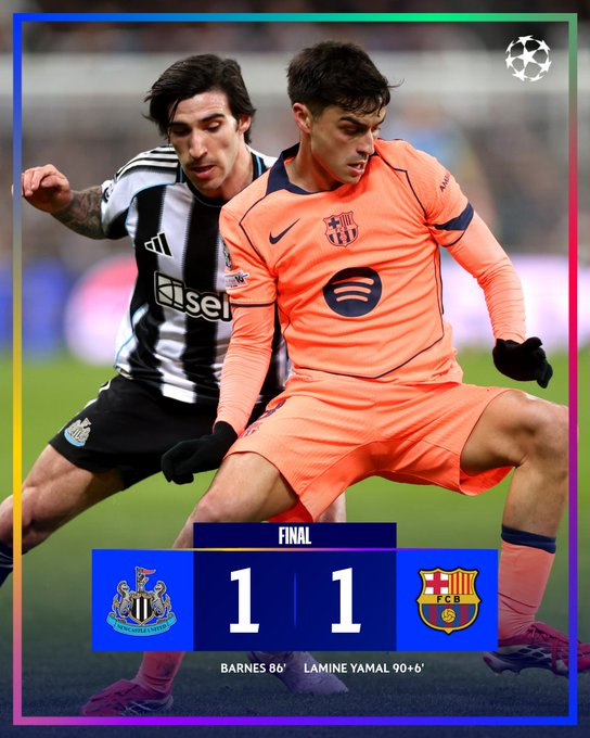 Al regreso de los vestuarios, no cambió el guión del choque, que era un querer y no poder por parte de ambos equipos. Hubo que esperar al 66’ para ver la primera ocasión clara, con un remate dentro del área de Robert Lewandowski que pasó cerca del poste izquierdo de Ramsdale. Seguidamente respondió el equipo local pero Jacop Murphy disparó por encima del larguero. Y cuando parecía que el 0-0 iba a campear en el luminoso, en el 86’ el Newcastle marcó por medio de Harvey Barnes cuando más lo intentaba. Y sin quererlo, en el descuento, el Barça se encontró en la última acción del duelo un penalti que transformó Lamine Yamal. Jugador del Partido: Harvey Barnes (Newcastle)