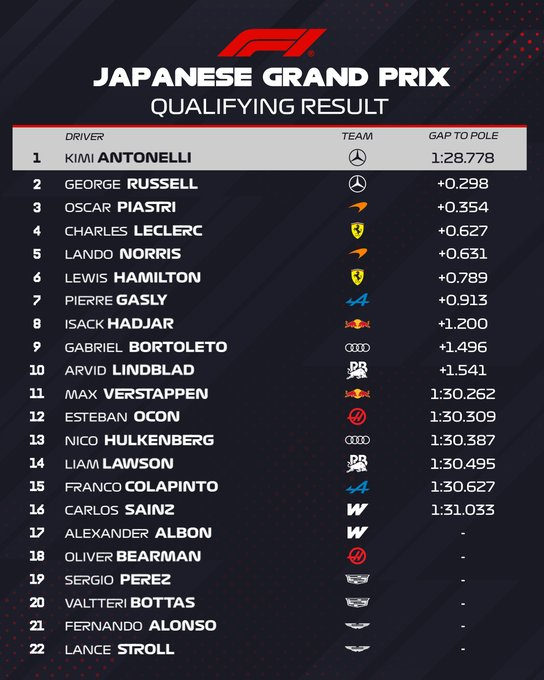 Antonelli, de 19 años, que en Shanghái se había convertido en el ‘poleman’ más joven de toda la historia de la F1, le ha cogido gusto a salir desde la posición de honor y solo dos semanas después acaba de firmar su segunda ‘pole’ en la categoría reina, al dominar la calificación de este sábado. Una gran vuelta en la tercera ronda, donde cubrió los 5.807 metros de la pista nipona en un minuto, 28 segundos y 778 milésimas, 298 menos que Russell, le valió para ser primero.