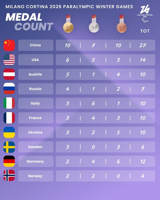 Cuando faltan 26 preseas de oro por disputar en los XIV Juegos Paralímpicos de Invierno de Milán-Cortina 2026, China encabeza la tabla con 10 primeros escaños, siete platas y 10 bronces, seguida por Estados Unidos (6-5-3), Austria (5-1-4), Rusia (4-1-2) y la anfitriona Italia (3-6-1).