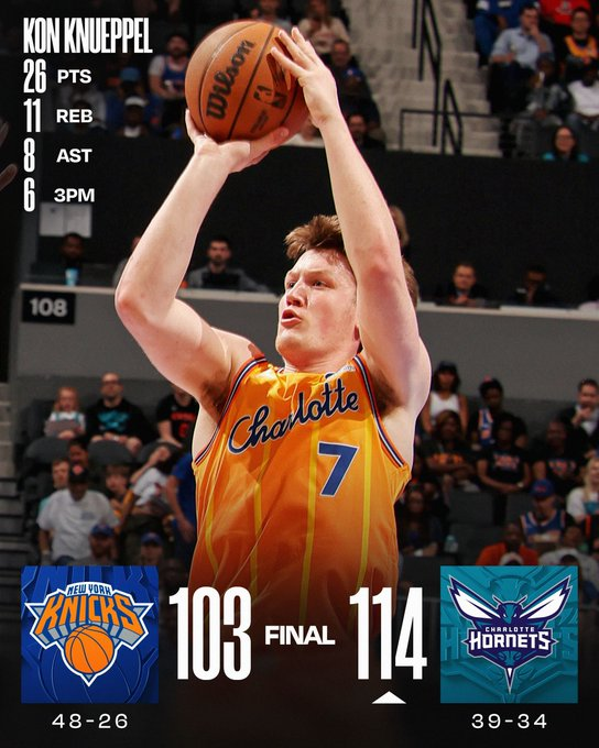Kon Knueppel anotó 26 puntos y encestó seis triples para convertirse en el jugador más joven en la historia de la NBA en alcanzar las 250 bombas en una temporada. Los Hornets rompieron la racha de siete victorias consecutivas de los New York Knicks. Knueppel, de 20 años, estuvo a punto de lograr su primer triple-doble, finalizando con 10 rebotes y ocho asistencias. LaMelo Ball aportó 22 puntos y Brandon Miller sumó 21 puntos y ocho rebotes para los Hornets, que acumulan cinco victorias seguidas. Charlotte (39-34) empató con Miami en el octavo lugar de la Conferencia Este, aunque el Heat tiene la ventaja en el desempate directo.