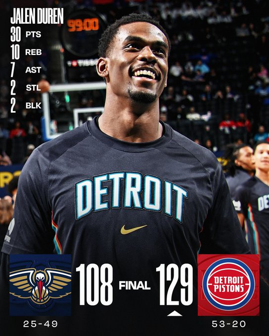 Jalen Duren anotó 30 puntos y capturó 10 rebotes para liderar a los Pistons en su victoria sobre los Pelicans. Kevin Huerter anotó 22 puntos y Daniss Jenkins aportó 19 para Detroit, que venía de una derrota en tiempo extra por 130-129 ante los Atlanta Hawks el miércoles. Los Pistons, normalmente uno de los peores equipos en tiros de tres puntos de la liga, tuvieron un 53.6% de efectividad (15 de 28) desde la línea de tres, incluyendo 9 de 14 de Huerter y Jenkins. Detroit llegó a tener una ventaja de hasta 15 puntos en el tercer cuarto, pero los Pelicans redujeron la diferencia a 92-88 en la primera posesión del último cuarto.