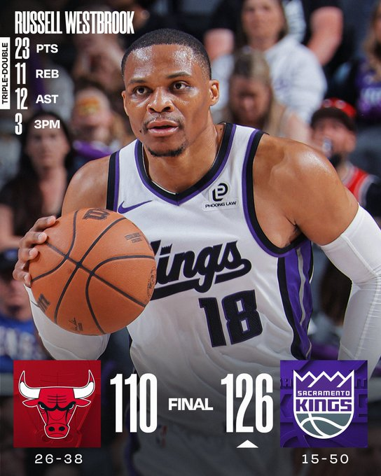 Russell Westbrook anotó 23 puntos, repartió 12 asistencias y capturó 11 rebotes para lograr el triple-doble número 208 de su carrera, récord de la NBA, y los Sacramento Kings vencieron a los Chicago Bulls 126-110 la noche del domingo.Westbrook encestó 7 de 17, con tres triples, en 35 minutos. Es el cuarto triple-doble de la temporada para el jugador de 37 años, quien quedó a una asistencia de superar a Mark Jackson y ubicarse sexto en la lista histórica de la NBA.