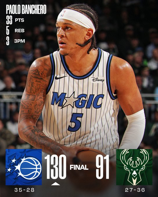 Paolo Banchero jugó un grandísimo partido ante los Bucks para que Orlando se lleve una cómoda victoria de visitante. El jugador con raices italianas sumó 33 puntos, 5 rebotes y 3 asistencias. Por el lado de Milwaukee, el mejor terminó siendo Bobby Portis, con un doble-doble de 18 puntos y 10 rebotes.