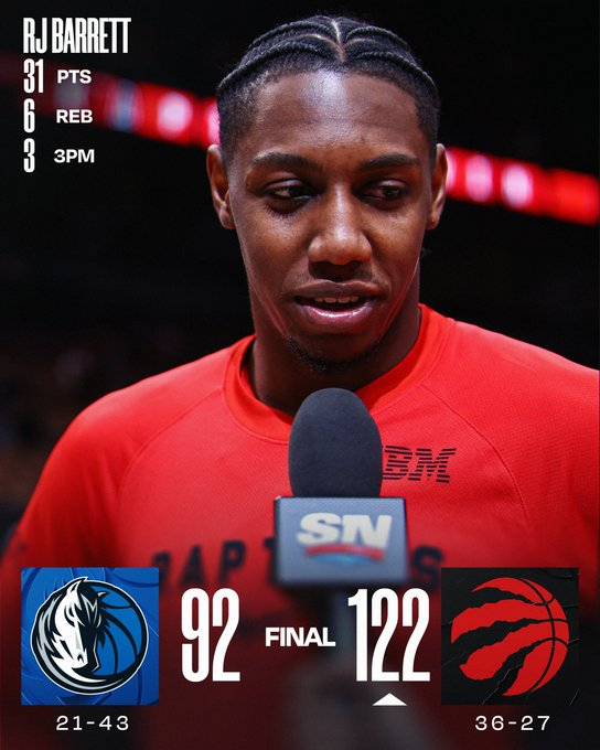 RJ Barrett firmó 31 puntos, su mejor marca de la temporada, en el cómodo triunfo de Toronto ante Dallas. Scottie Barnes sumó 17 tantos y Jakob Poeltl registró 16 puntos y 10 rebotes. Los Mavericks, que tuvieron 21 unidades de Daniel Gafford, sufrieron su séptima derrota consecutiva.