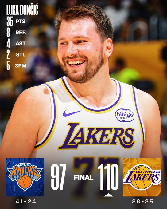 Luka Doncic lideró a los Lakers con 35 puntos y ocho rebotes en una victoria conseguida sin LeBron James, ausente por lesión. Austin Reaves sumó 25 unidades y el equipo angelino dominó gran parte del partido pese a un intento de remontada de los Knicks en el último cuarto. Karl-Anthony Towns terminó con 25 puntos y 16 rebotes.
