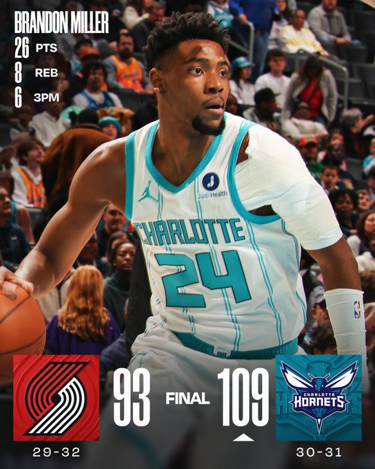 Brandon Miller firmó 26 puntos y 8 rebotes con 6 triples, clave en la cuarta victoria seguida de Charlotte. Coby White añadió 20 desde el banco, LaMelo Ball 15 y 8 asistencias, y Moussa Diabate 13 tantos con 11 rebotes y 5 asistencias para dejar al equipo 30-31. Portland jugó con Jrue Holiday que hizo 25 y Jerami Grant 21 sin Deni Avdija (espalda).