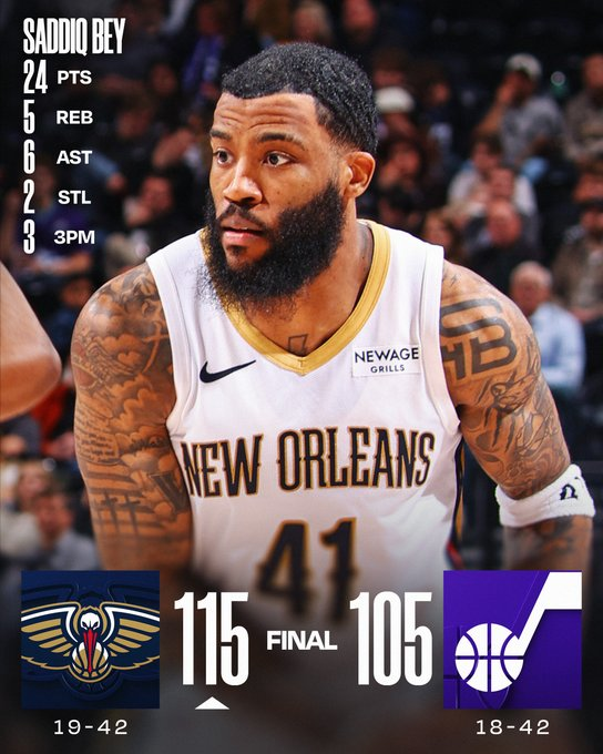 Saddiq Bey anotó 24 tras su reciente explosión de 42 y lideró la cuarta victoria seguida pese a la salida temprana de Zion Williamson (tobillo). Jeremiah Fears y Bryce McGowens sumaron 18 cada uno; Herbert Jones 17 (10 en el primer tiempo) y Fears añadió 11 rebotes y 5 asistencias. Utah, que perdió su quinto al hilo, tuvo 21 de Isaiah Collier y 17 de Keyonte George.