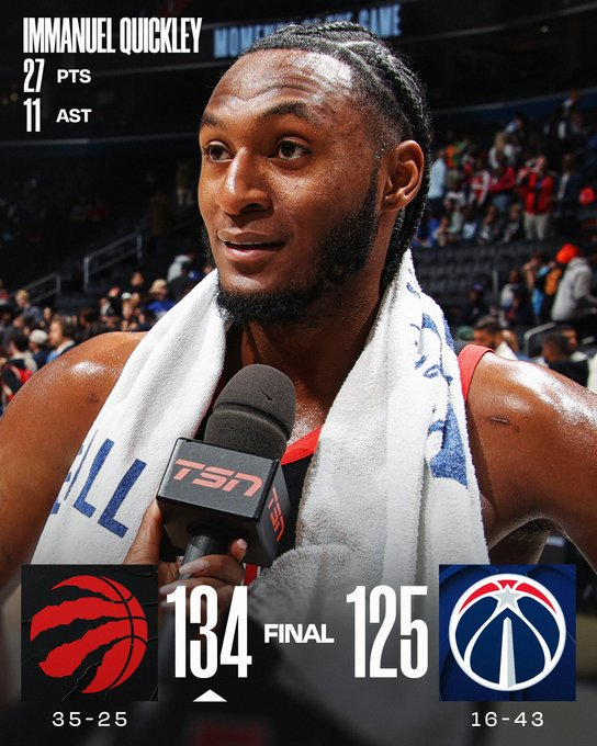 Immanuel Quickley brilló con 27 puntos y 11 asistencias, acompañado por Brandon Ingram (24), RJ Barrett (21) y un quinteto titular con todos en 18+ para consolidar el quinto puesto del Este. Scottie Barnes y Jakob Poeltl anotaron 18 (este último con 10 rebotes). Washington tuvo 19 de Will Riley y 14 de Coulibaly y George, además de un 64-26 en puntos de banca.