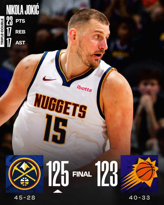 Nikola Jokic firmó un ‘triple-doble’ de 23 puntos, 17 rebotes y 17 asistencias (su tope de la temporada) para firmar un triple-doble en el triunfo de los Denver Nuggets por 125-124 ante los Phoenix Suns.