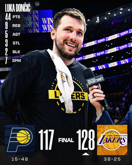 Luka Doncic explotó con 44 puntos en solo tres cuartos para guiar a los Lakers sin LeBron James, que descansó. El base esloveno anotó siete triples y salió del partido antes del último periodo. Pascal Siakam lideró a Indiana con 26 puntos en la octava derrota seguida de los Pacers.