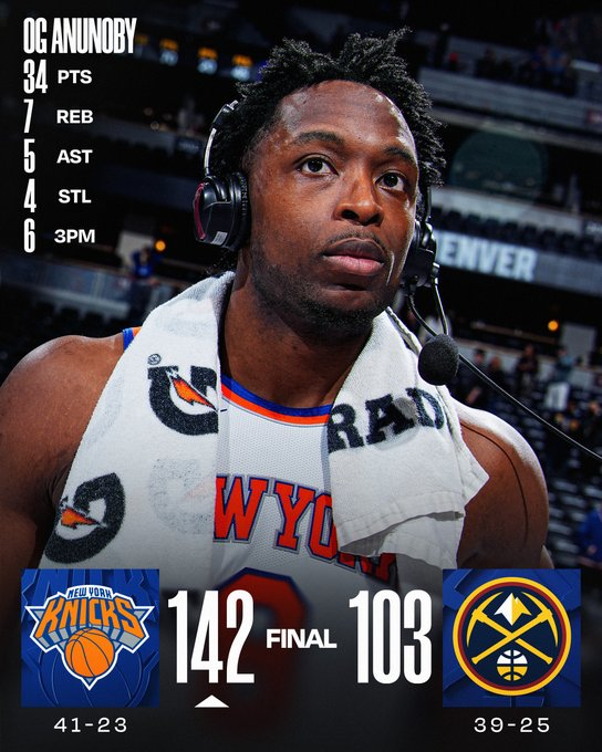 OG Anunoby lideró la paliza de Nueva York con 34 puntos, acompañado por 19 puntos y 17 rebotes de Karl-Anthony Towns. Denver solo pudo responder con 38 puntos de Nikola Jokic y además perdió por lesión en el tobillo a Jamal Murray antes del descanso. La derrota por 39 igualó la peor caída en casa en la historia de la franquicia.