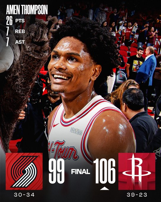 Alperen Sengun anotó 28 puntos y Amen Thompson agregó 26 para liderar la remontada de Houston en el último cuarto. Los Rockets firmaron un parcial de 23-4 para darle la vuelta al partido y contaron también con 20 puntos de Kevin Durant. Portland tuvo a Jerami Grant como máximo anotador con 21.