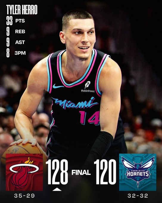 Tyler Herro brilló con 33 puntos, 9 rebotes y 9 asistencias para que Miami cortara la racha de seis victorias de Charlotte. Bam Adebayo añadió 24 puntos y 12 rebotes, mientras que los Hornets tuvieron a Kon Knueppel como máximo anotador con 27 puntos. Miami acertó 18 triples para asegurar su cuarta victoria seguida.