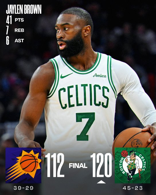 Jaylen Brown explotó con 41 puntos, incluidos 18 en el último cuarto, para guiar a los Celtics en el cierre del partido. Jayson Tatum sumó 21 puntos en su quinto encuentro tras regresar de su lesión de tendón de Aquiles, mientras Derrick White y Payton Pritchard aportaron 21 y 19 respectivamente. Los Celtics cerraron con un parcial final de 12-1 para asegurar la victoria. En los Suns, Devin Booker anotó 40 puntos y Jalen Green agregó 21.