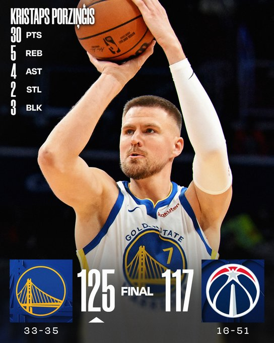 Kristaps Porzingis anotó 30 puntos y De’Anthony Melton agregó 27 para que los Warriors cortaran una racha de cinco derrotas. El triunfo también significó la victoria número 600 como entrenador para Steve Kerr. Golden State jugó sin Stephen Curry, Jimmy Butler, Seth Curry y Al Horford, pero controló gran parte del juego. En los Washington Wizards, Trae Young terminó con 21 puntos.