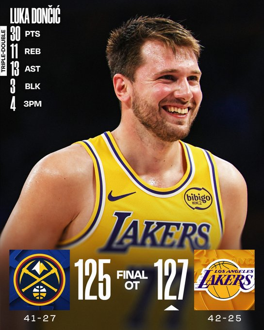 Luka Doncic definió el partido con un tiro en suspensión a 0,5 segundos del final del tiempo extra y terminó con un triple-doble de 30 puntos, 13 asistencias y 11 rebotes. Austin Reaves había forzado el suplementario con una jugada brillante tras fallar adrede un libre y anotar el rebote para cerrar con 32 puntos. Nikola Jokic registró 24 puntos, 16 rebotes y 14 asistencias para su triple-doble número 27 de la temporada, mientras Aaron Gordon lideró a Denver en anotación con 27. Los Lakers extendieron su racha a cinco victorias en la lucha por los puestos altos del Oeste.