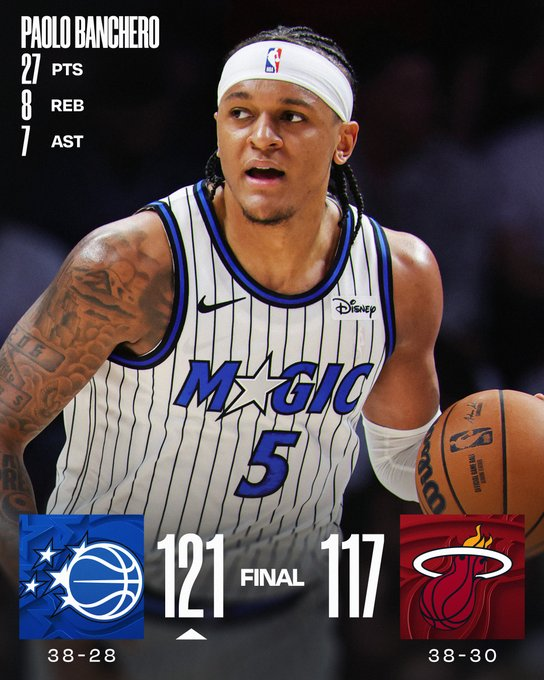 Paolo Banchero comandó a Orlando con 27 puntos y Desmond Bane aportó 21 en un triunfo que extendió a siete la racha del Magic. Wendell Carter Jr. añadió 15 para un equipo que llegó a sacar 22 de ventaja y se colocó 5-0 ante Miami esta temporada. Jaime Jaquez Jr. lideró al Heat con 22 puntos, mientras Bam Adebayo y Norman Powell sumaron 20 cada uno.}