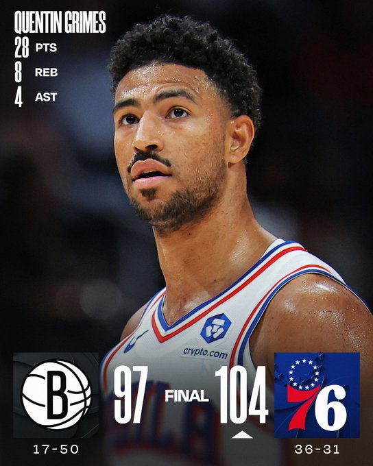 Quentin Grimes firmó su mejor actuación de la temporada con 28 puntos y 8 rebotes (10/22 de campo) para sostener a unos Sixers muy diezmados por las ausencias de Joel Embiid, Tyrese Maxey y Kelly Oubre Jr. Danny Wolf sumó 15 puntos y 10 rebotes y Josh Minott agregó 14 para unos Nets que lanzaron apenas 36% de campo.
