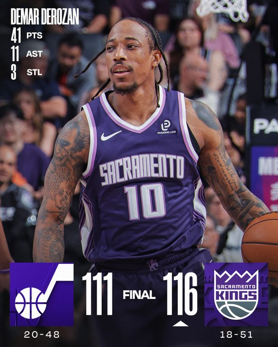 DeMar DeRozan anotó un máximo de la temporada de 41 puntos y repartió 11 asistencias para ayudar a los Kings de Sacramento a resistir ante el Jazz de Utah y ganar 116-111 la noche del domingo.DeRozan, quien la semana pasada superó al miembro del Salón de la Fama Tim Duncan para colocarse en el 18vo puesto de la lista histórica de anotadores de la NBA, acertó 11 de 21 tiros de campo y alcanzó los 40 puntos por primera vez desde el 2 de febrero de 2025. Fue la 417ma vez que anota 20 o más puntos con al menos un 50% de acierto.Precious Achiuwa sumó 20 unidades y 11 rebotes en el duelo entre los dos peores equipos de la Conferencia Oeste.