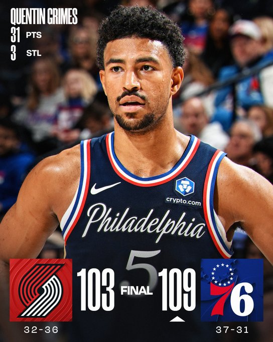 Philly se quedó con una nueva victoria de local luego de vencer a Portland con una gran actuación de Quentin Grimes, que aportó 31 puntos, 3 rebotes y 2 asistencias. Por el lado de los perdedores, Deni Avdija finalizó con 25 tantos y 9 asistencias.