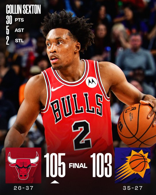Collin Sexton lideró a Chicago con 30 puntos para asegurar una victoria ajustada en Phoenix. Tre Jones acompañó con 21 tantos y Guerschon Yabusele agregó 16. Devin Booker encabezó a los Suns con 27 puntos en su regreso tras lesión, mientras Grayson Allen sumó 21. Jalen Green tuvo 12 puntos pero con baja efectividad (5/20 de campo). Phoenix recortó una desventaja de 12 puntos en el cierre, pero no logró tomar la delantera en la última posesión.