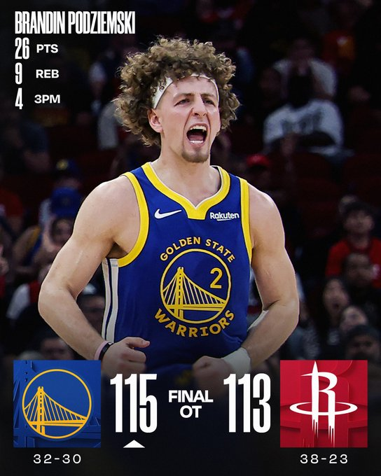 Golden State se llevó un duelo cerrado en tiempo extra pese a seguir sin Stephen Curry. Brandon Podziemski fue figura con 26 puntos y De’Anthony Melton agregó 23, incluyendo una bandeja tras rebote ofensivo en los segundos finales del suplementario. Al Horford sumó 17 para los Warriors. En Houston, Reed Sheppard lideró con 30 puntos y 6 triples, mientras Kevin Durant aportó 23.