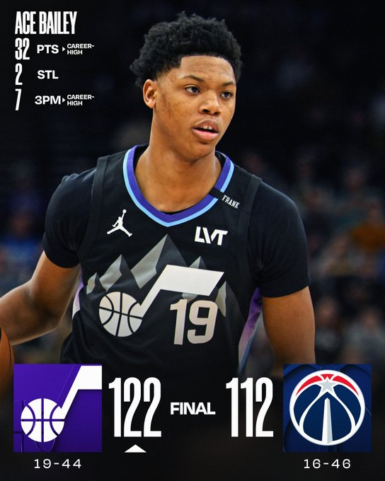 Ace Bailey explotó con un récord personal de 32 puntos, incluyendo 7 triples y 21 unidades en la primera mitad para Utah. En Washington debutó Trae Young tras su traspaso y registró 12 puntos y 6 asistencias en 19 minutos con restricción de juego. El novato Juju Reese fue lo más destacado de los Wizards con 18 puntos y 20 rebotes, la mayor cifra reboteadora para un rookie esta temporada. Utah cortó una racha de siete derrotas mientras Washington llegó a siete caídas consecutivas.