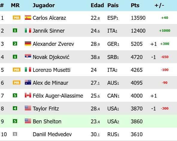 A destacar, también, la subida de ocho plazas por parte de Jiri Lehecka, que con la final de Miami logra su mejor posición histórica subiendo a la 14ª plaza y ya mira con ojos golosos su posible inclusión en el Top 10, aunque todavía la tiene algo lejos, a unos 1120 puntos en una plaza que marca Daniil Medvedev como frontera.